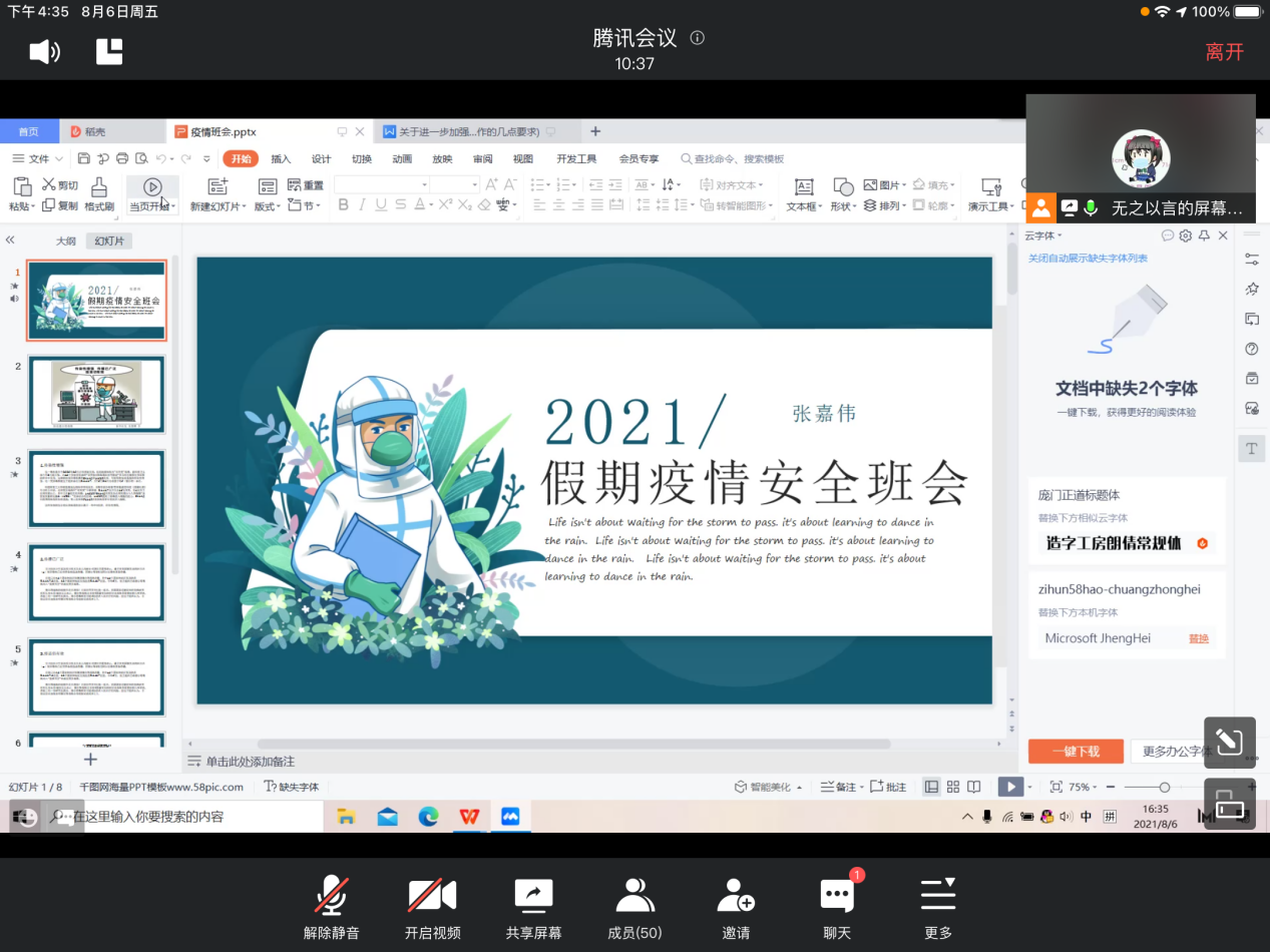 本站讯 为响应国家疫情防控政策,进一步加强疫情防控工作,提高暑假防疫意识。8月6日下午,pg电子官方网站2020级统计1班开展了疫情防控和心理健康安全会议。本次会议由生活委员张嘉伟和心理委员孙善玺、陈荟如主持,2020级统计1班全体学生参与。