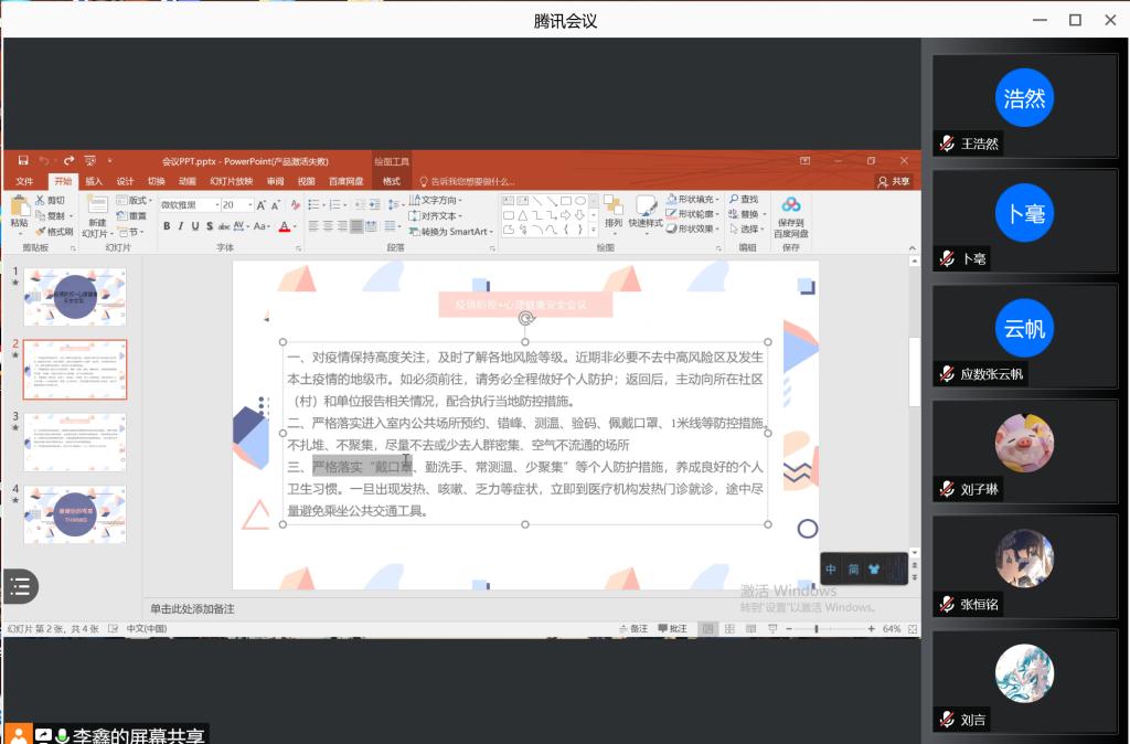 李鑫和马培博分别就疫情防控和心理健康问题进行了详细的说明。针对近期疫情局势,李鑫提出关于进一步加强疫情防控工作的几点要求,在校生暂不离校,坚持“非必要不外出”,外出需向辅导员报备请假;暑期离校学生严格遵守学校返校要求,暂不返校;全体同学随时关注健康码和通信大数据行程卡,一有情况及时上报;严格实行网格化管理,建立“辅导员-班委-舍长-同学”四级网格化机制,全面掌握每位学生的行程信息。随后,马培博强调了疫情特殊时期心理健康的问题,提醒大家摆平心态,慌而不恐;不信谣不传谣;接受疫情所带来的变化,学会换位思考。提醒同学们建立充分的人际支持系统,将有助于自己心理状态的调整。着重强调同学们宅家时进行适当的体育运动,通过运动增强肌肉的力量,有助于恐惧、焦虑、抑郁等情绪的调整。