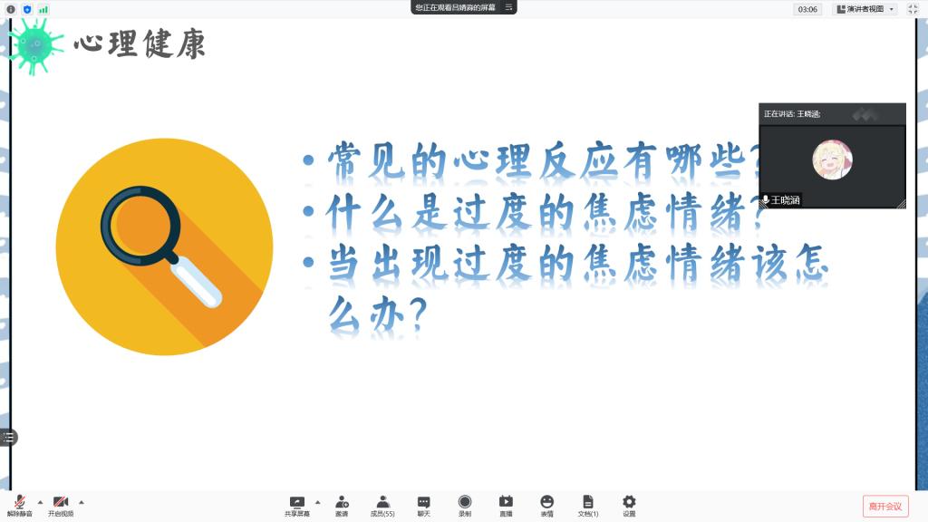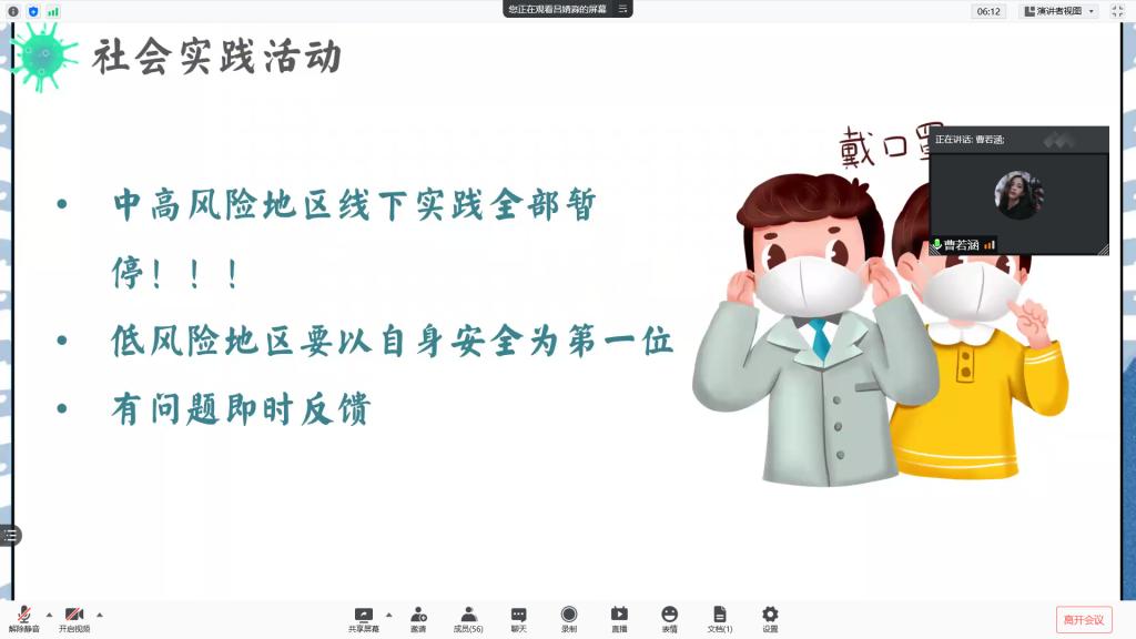 针对近期疫情局势,石雨葭就“防疫与安全”提出关于进一步加强疫情防控工作的几点要求:在校生暂不离校,坚持“非必要不外出”;暑期已离校学生暂不返校,按照学校通知时间有序返校;全体同学随时关注健康码和通信大数据行程卡;严格实行网格化管理,建立“辅导员-班委-舍长-同学”四级网格化机制,全面掌握每位学生的行程信息;提醒同学们注意交通安全、金融安全、饮食安全、极端天气、疫情防控。王晓涵在心理健康方面建议同学们从行动上积极应对,做好心理上的自我调整,保持乐观心态。曹若涵就暑期社会实践提出中高风险地区线下实践全部暂停;低风险地区要以自身安全为第一位进行暑期社会实践活动;有问题应即时进行反馈。