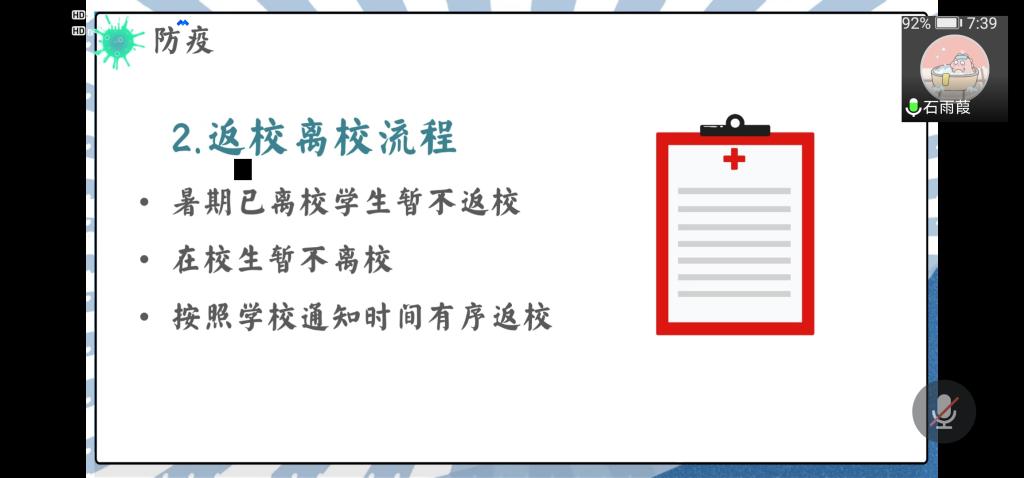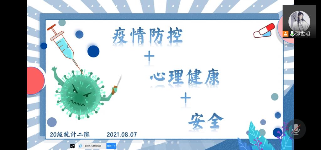 本站讯 为响应国家疫情防控政策,加强疫情防控工作的落实,提高同学们暑期防疫意识,8月7日下午,pg电子官方网站2020级统计2班开展了疫情防控暨心理健康安全线上班会。本次班会由邵世明主持,2020级统计2班全体同学参与。