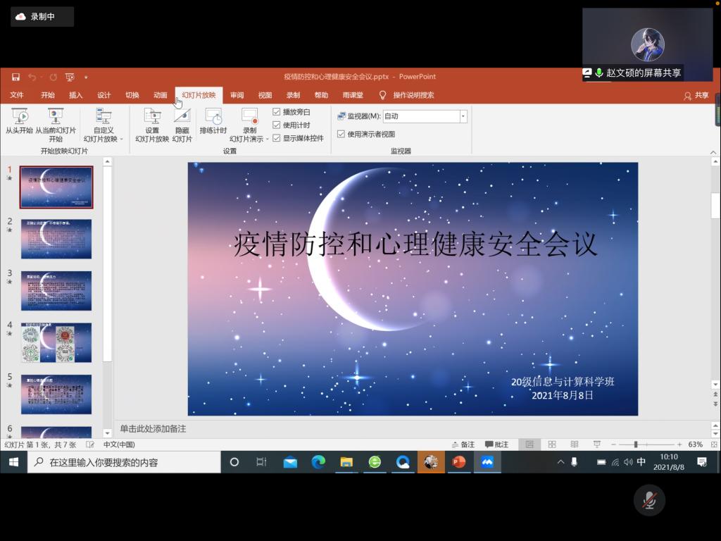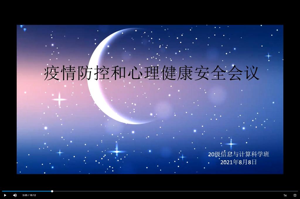 本站讯为响应国家疫情防控政策,提高学生假期防疫意识,8月8日上午,pg电子官方网站2020级信息与计算科学班准时召开“疫情防控和心理健康安全”线上班会。本次班会由2020级信息与计算科学班生活委员梁钰峰,心理委员赵文硕、倪嘉杭主持。2020级信息与计算科学班全体同学参与。