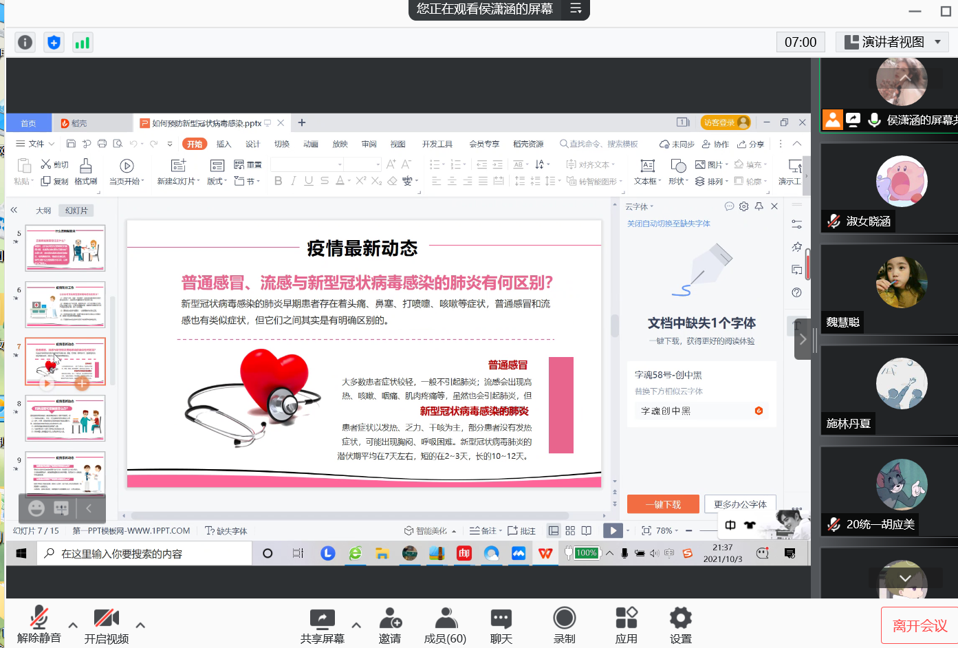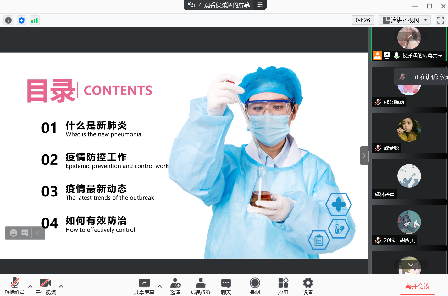 会议伊始,侯潇涵简要介绍了会议主题,通过四个方面向大家讲解如何正确预防新冠肺炎疫情,简要的介绍让大家初步了解了本次会议的主题和学习方向。紧接着通过一段视频,介绍了中国在面对世界变化全球疫情困局的情况下给出的答案,让团员们体会到了中国在面对严峻疫情考验的情况下展现出的力量和决心。视频观看结束,侯潇涵带领各位团员仔细学习疫情防控的具体行动,并提醒同学们加强重视,增强大家对疫情防控情况的了解。在“疫情就是命令,防控就是责任”的感召下,通过组织同学们学习疫情相关知识,确保同学们真正掌握防疫相关知识,号召大家时刻关注疫情发展,做好个人防护措施。