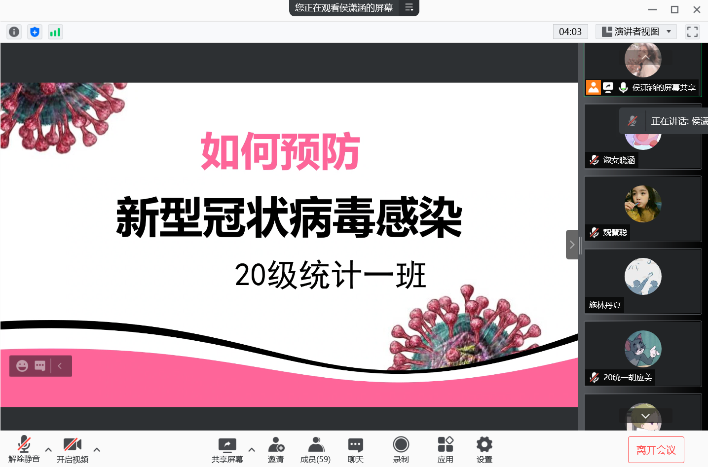 本站讯 10月2日晚,pg电子官方网站2020级统计一班举行线上“提高防疫意识,做好自我防护”主题团日活动,着重强调当前疫情防控的重要性以及正确防控措施。本次主题团日由团支书侯潇涵主持,全体团员参加。