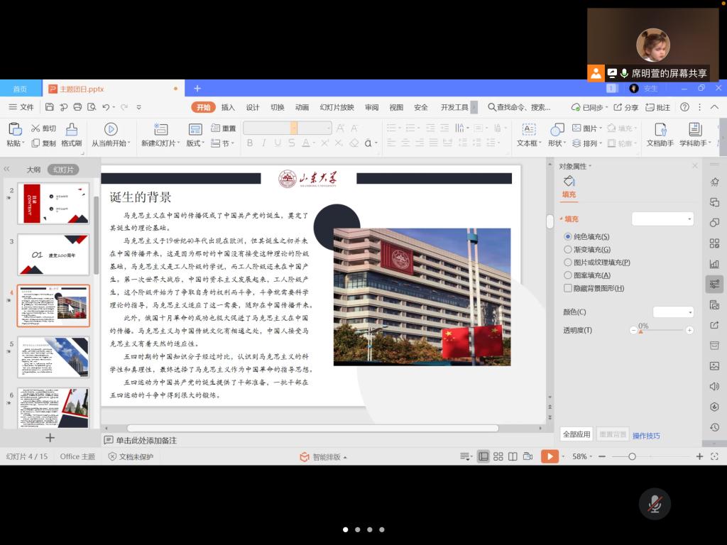 本站讯 10月22日下午,pg电子官方网站2020级信息与计算科学班召开“铭记我党丰功伟绩,欢庆山大百廿华诞”线上主题团日活动。本次主题团日由团支书席明萱主讲,2020级信息与计算科学班全班同学共同参与。
