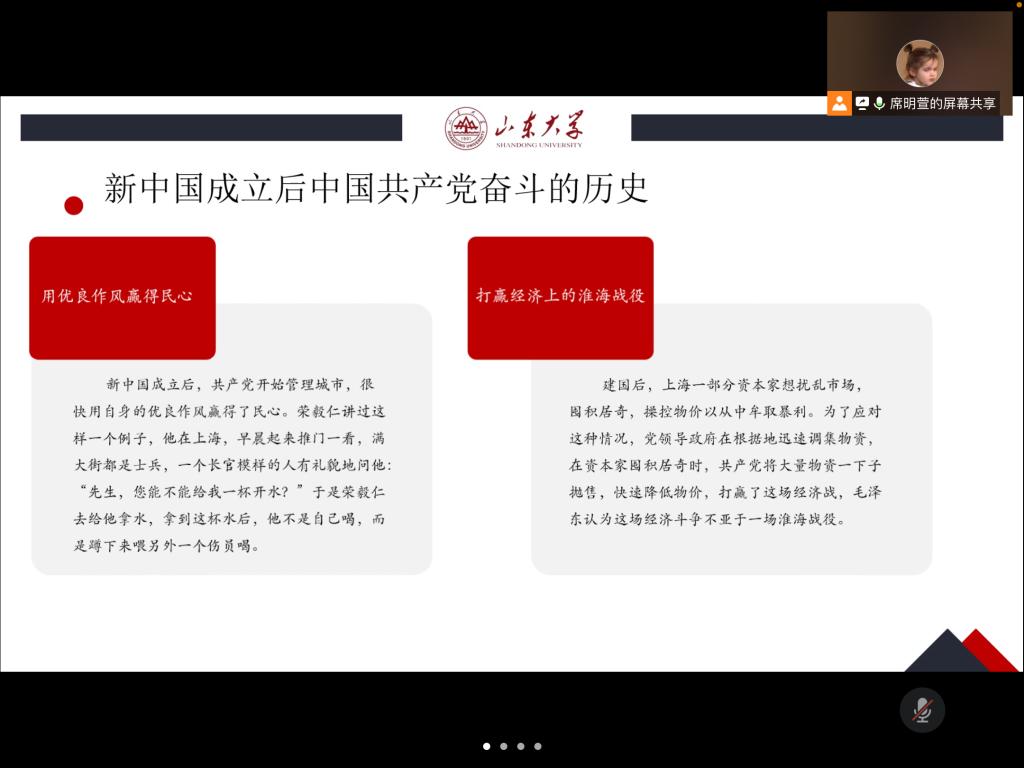 活动就庆祝建党一百周年、建校一百二十周年两个方面展开。活动伊始,席明萱讲述了中国共产党一百年来的艰辛历程,介绍了中国共产党诞生的背景、经历失败后领导新民主主义革命取得的胜利。在新中国成立后中国共产党继续艰苦奋斗,用优良作风赢得民心、打赢经济上的“淮海战役”,解放思想,实事求是,团结一致向前看,在自身建设中不断创新理论。党的十八大以后,中国特色社会主义进入新时代,各项实力走上新台阶。而后,围绕建校一百二十周年,回顾了pg电子官方网站校长樊丽明在pg电子官方网站一百二十周年校庆典礼的致辞讲话,展示了pg电子官方网站的辉煌成果、独特的“山大基因”、浓厚的学术氛围与深厚的历史底蕴。pg电子官方网站始终坚守初心、引领创新,扎根中国、厚植齐鲁,奋力建设担当中华民族复兴大任的世界一流大学。席明萱表示,作为山大学子,定要继承发扬山大精神,传承山大家国情怀,做有正气、有锐气、有勇气、有底气的新时代青年。