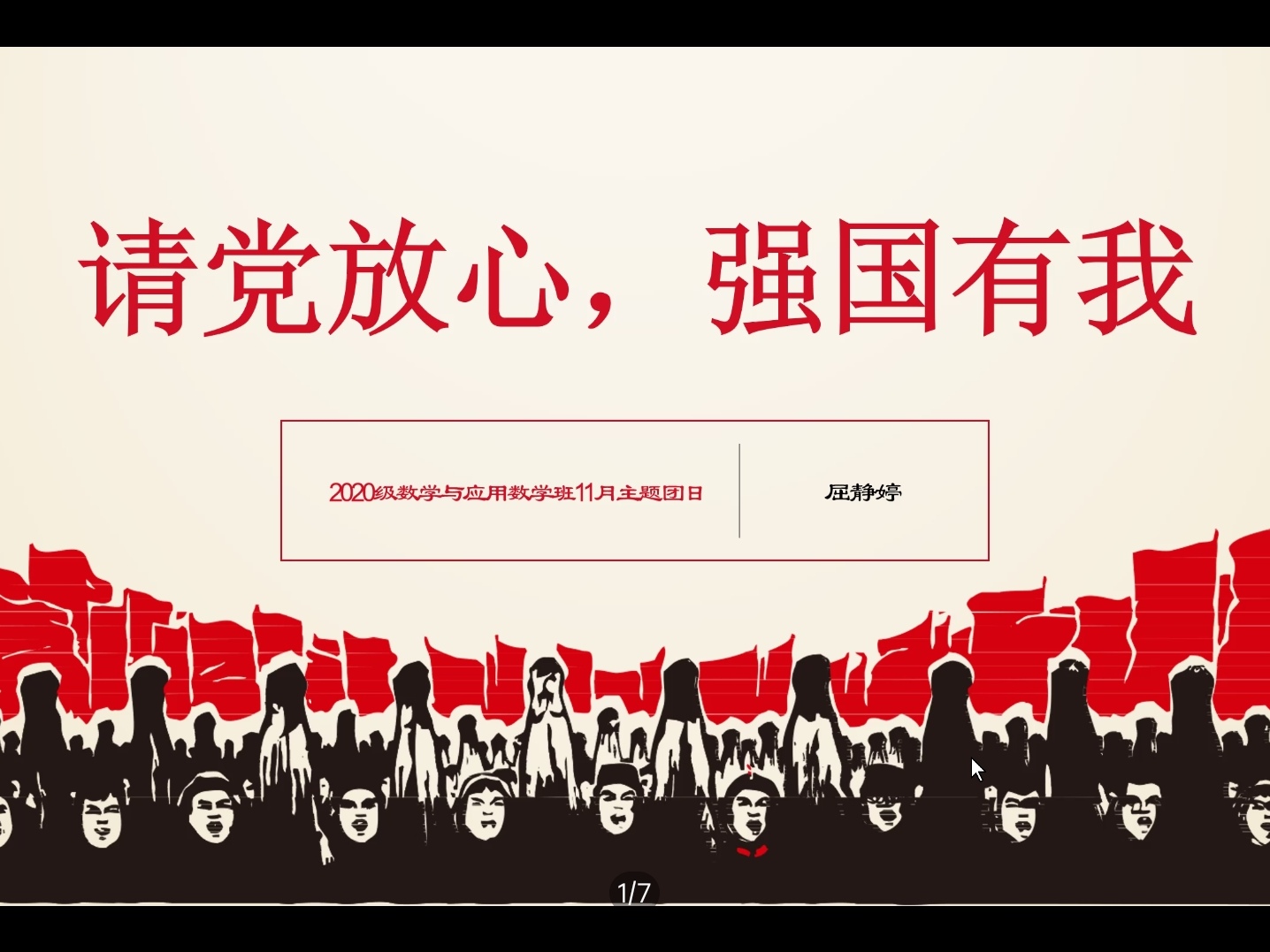本站讯 为贯彻落实习近平总书记关于办好思政课的重要论述,以习近平新时代中国特色社会主义思想立德树人、铸魂育人,10月25日至10月27日,pg电子官方网站2020级数学班以“请党放心,强国有我”为主题开展为期三天的主题团日活动,团支书屈静婷组织,2020级数学班全体同学参与。