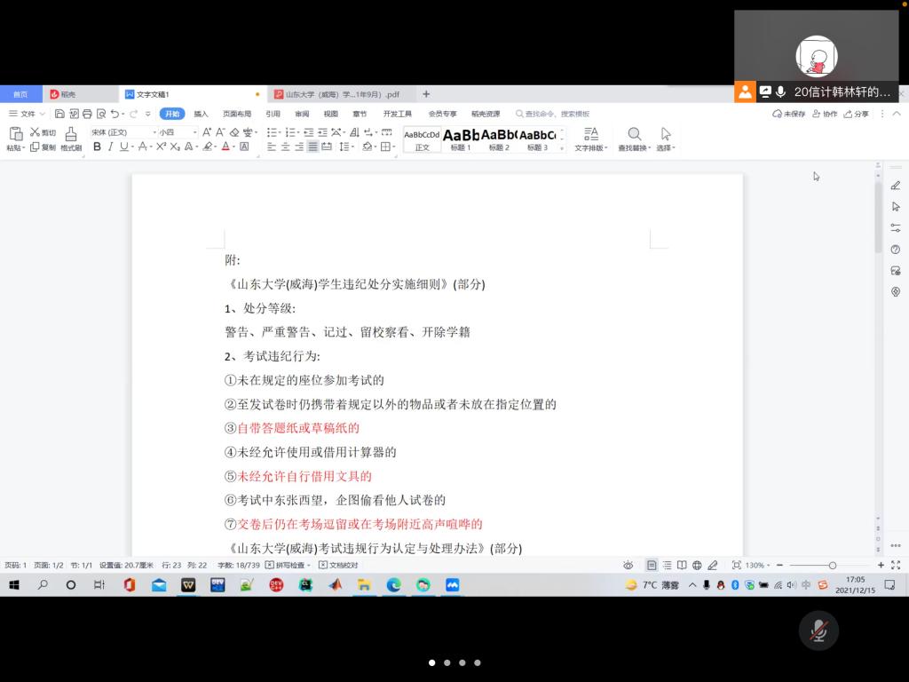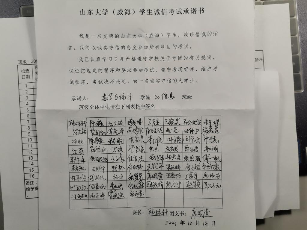 首先,韩林轩向同学们说明了诚信考试的重要性。诚信考试是为了通过考试培养学生的诚信品质,让学生排除外界干扰,正确认识考试对评价自己的重要性。韩林轩带领同学们学习了《普通高等学校学生管理规定》《pg电子官方网站(威海)学生违纪处分实施细则》文件中关于考试违纪行为的相关规定,阐述了考试作弊的危害,指出考试作弊的相关处分,以及处分对今后学习与发展的影响,告诫大家不要出现考试违规行为,重视诚信,提醒同学们认真备考。班会结束后,韩林轩组织同学们签署了诚信考试承诺书,要求同学们端正考试态度,诚信考试,确保考试的公平性,共同建设pg电子官方网站和信息与计算科学班的良好学风。