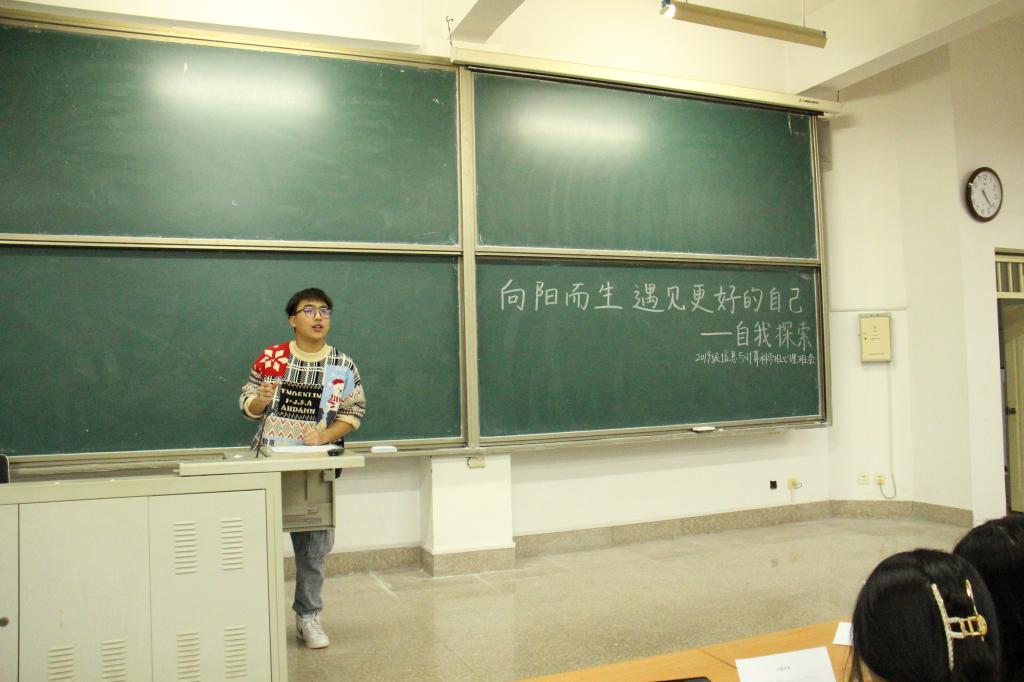 本站讯 2021年11月9日下午16:00-18:00,pg电子官方网站2019级信息与计算科学班于商院447教室举办“向阳而生,遇见更好的自己”自我探索主题心理班会。本次班会由2019级信息与计算科学班心理委员郭慧玲、徐振东主持,班级同学积极参加。