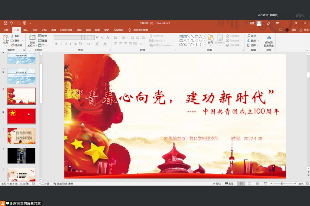 本站讯 4月28日晚,pg电子官方网站2020级信息与计算科学班开展“青春心向党,建功新征程”主题团日活动。活动由团支书席明萱主讲,2020级信息与计算科学班全班同学共同参与。
