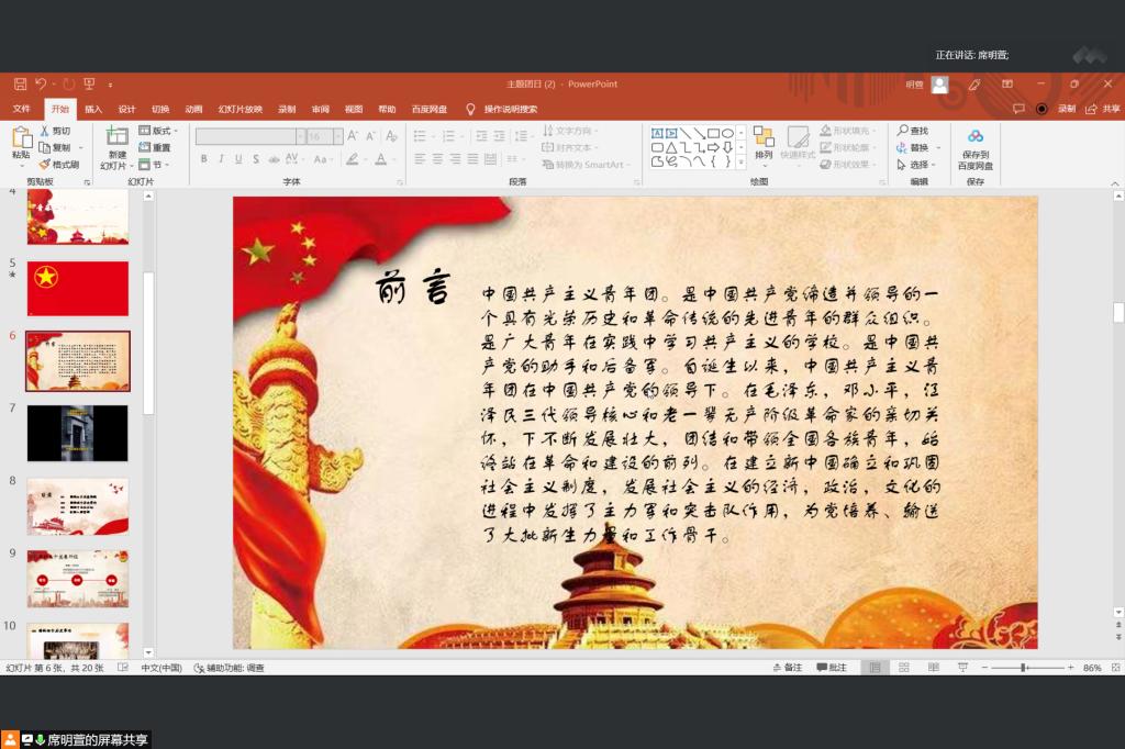 本次主题团日主要内容分为团的三个发展阶段、团的两个历史事件、团的十七次会议、重温入党誓词四个部分。首先,席明萱播放了一个关于共青团的历史的小视频,简单明了地介绍了共青团的诞生历程,引入活动主题。席明萱介绍了团的诞生、发展、辉煌三个阶段的时间段与所在阶段革命所属的性质。在团的两个历史事件和团的十七次会议,分别介绍了五四运动与“一二·九”运动发生的故事和团的十七次中团一大到团四大召开的历史背景以及参会的主要人物,带领同学们重新回顾了那段岁月。然后,席明萱带领同学们重温了入团誓词,也是重温入团的决心和信念,是一种鞭策和激励。最后,席明萱提出关于共青团的光荣道路以及共青团的优良传统如何继承与发扬的问题,引发同学们深思。