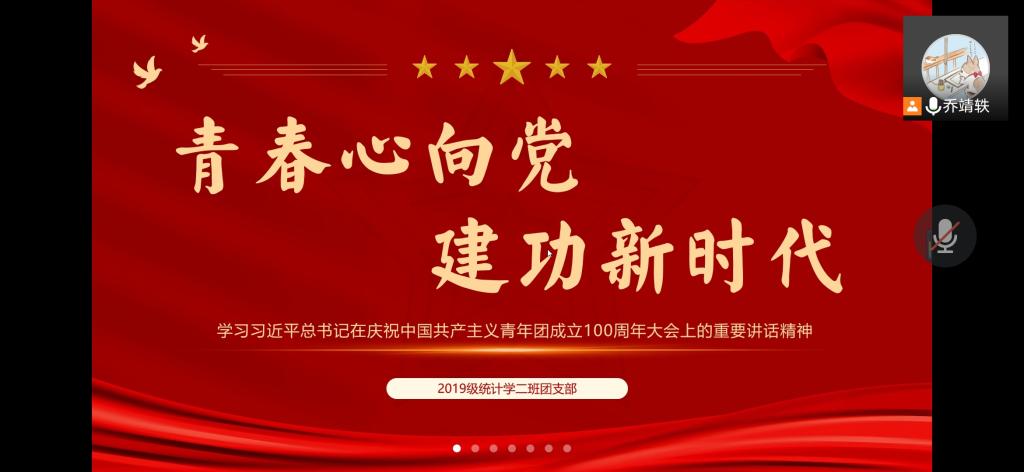 本站讯 为鼓励团支部成员争做时代青年,勇于奉献青春,2022年6月1日下午15:30,pg电子官方网站2019级统计学二班线上组织“青春心向党,建功新时代”主题团日活动。本次活动由团支书乔靖轶主持,辅导员王祎璠和19级统计学二班团支部全体同学参加。