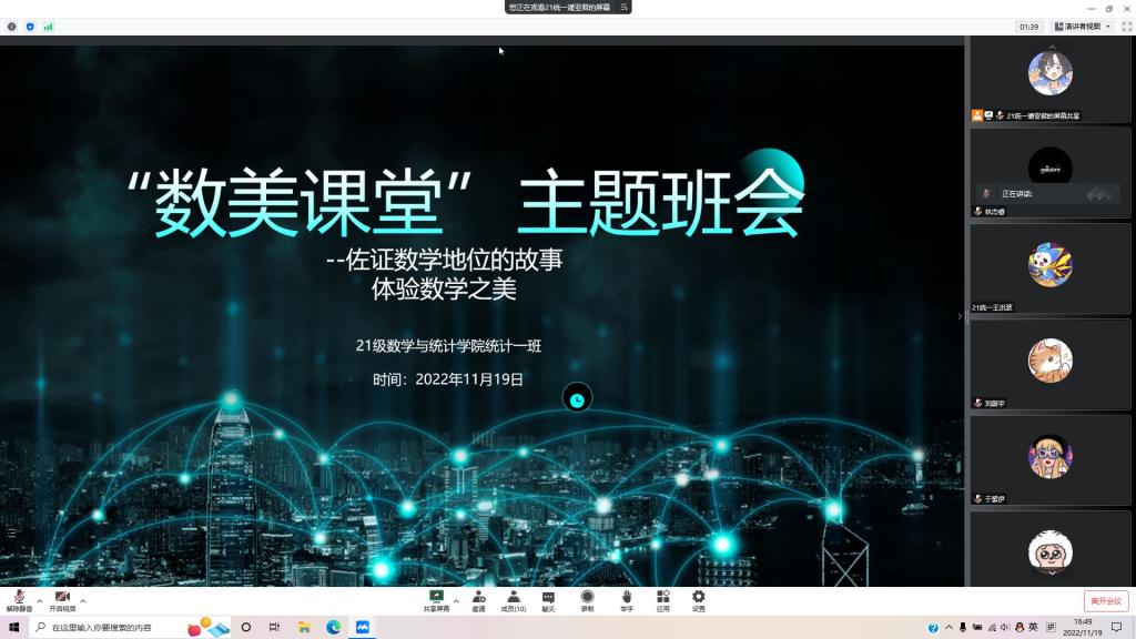 本站讯 11月19日,pg电子官方网站2021级统计一班在线上以腾讯会议的形式开展“数美课堂”主题团日活动,本次主题团日活动由团支书林杰睿主持,由2021级统计学01班学习委员潘亚君同学主讲。2021统计01班全体成员参加了本次会议。